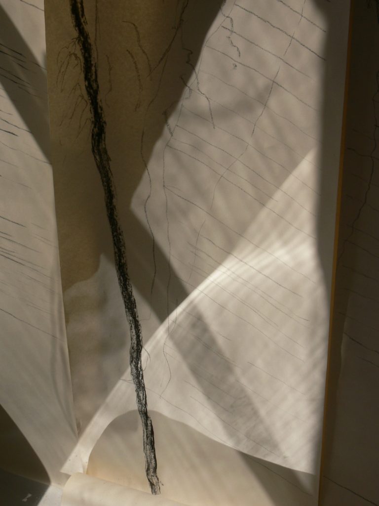“As a sculptor I have a visceral response to the reality of mass, volume and weight – tectonic form – grounded, cantilevered, suspended – understanding where the centre of gravity lies is second nature to me. Observing the movement of the river currents through the Pool of London unsettles my certainty about the weight and measure of material matter. I am reminded to acknowledge the fluid, dense weight of the water as I attempt to read the dynamic swell, heave, shift and whirl of a turning current. There is a desire to capture fleeting moments of time and tide”.