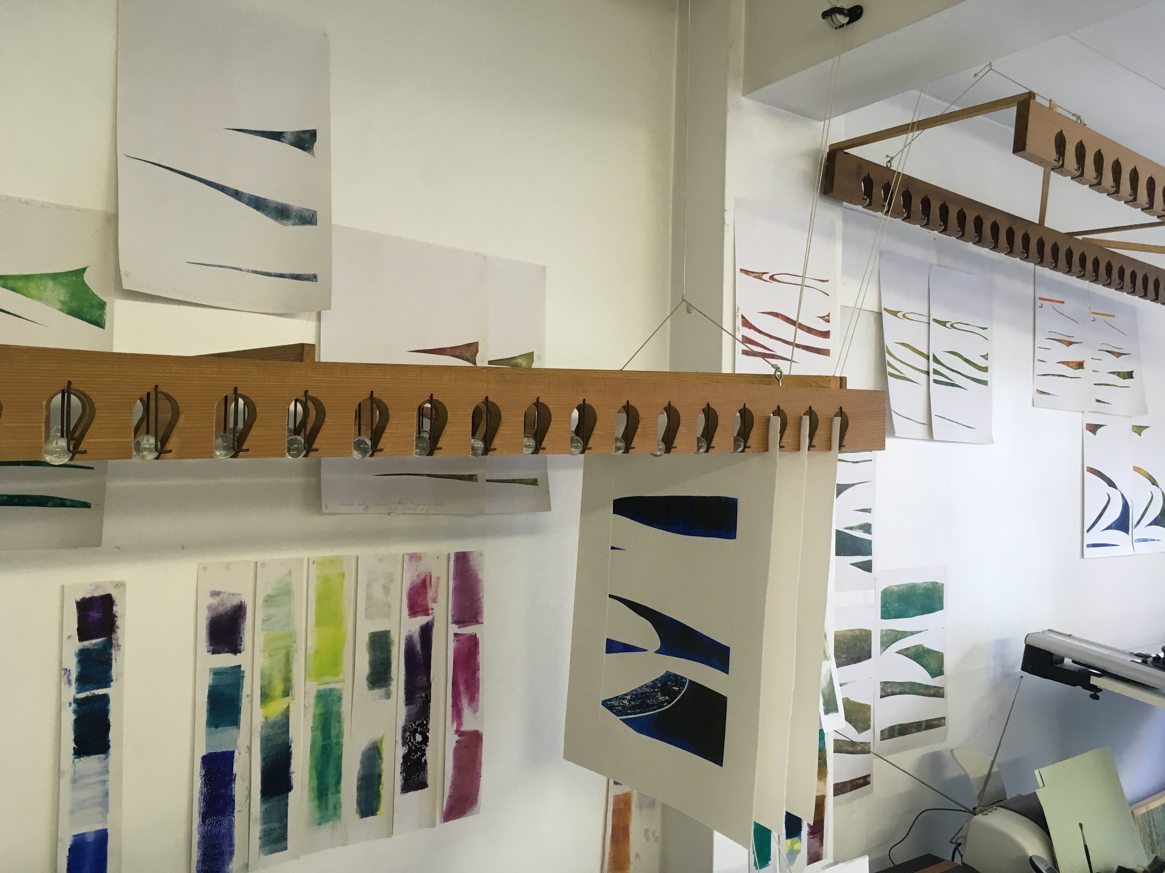 “The process of cutting a shape of movement while making the plate, reflected my desire to fix a moment in time. The fluidity of the ink and the mixing of colour as I inked up a plate, reminded me of reflected light on the surface of the water and the shadowed depths beneath. The embossed image attempts to solidify a moment in time and space and yet the image is still on the move!”
