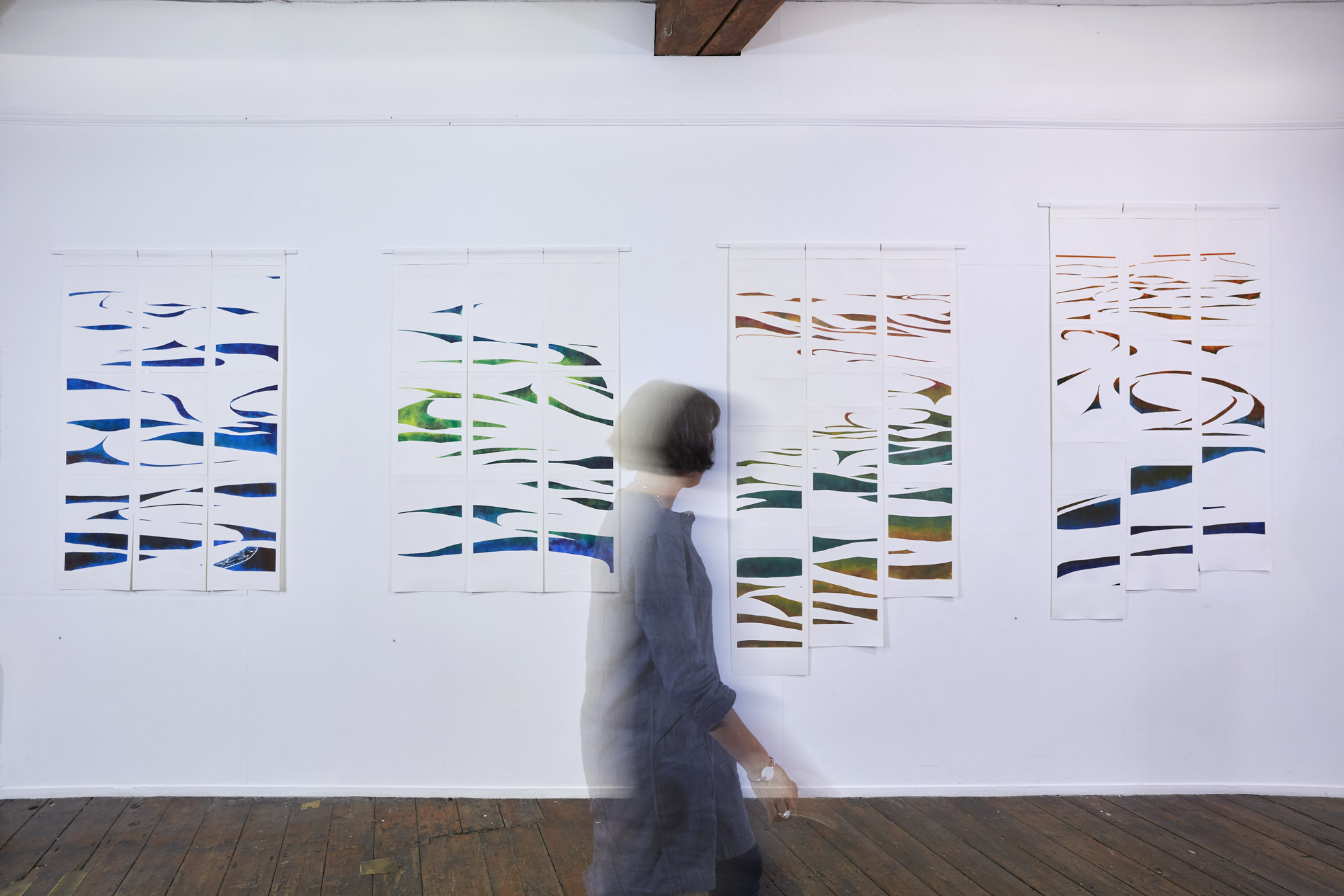 The dynamics of the flow and continuous changes of current preoccupy Abigail Downer’s creative process: Interpreting the weight and movement of tidal water as it is channelled through the Pool of London, Abigail is inspired to work with and against time to hold moments of change in a series of spatial print images.