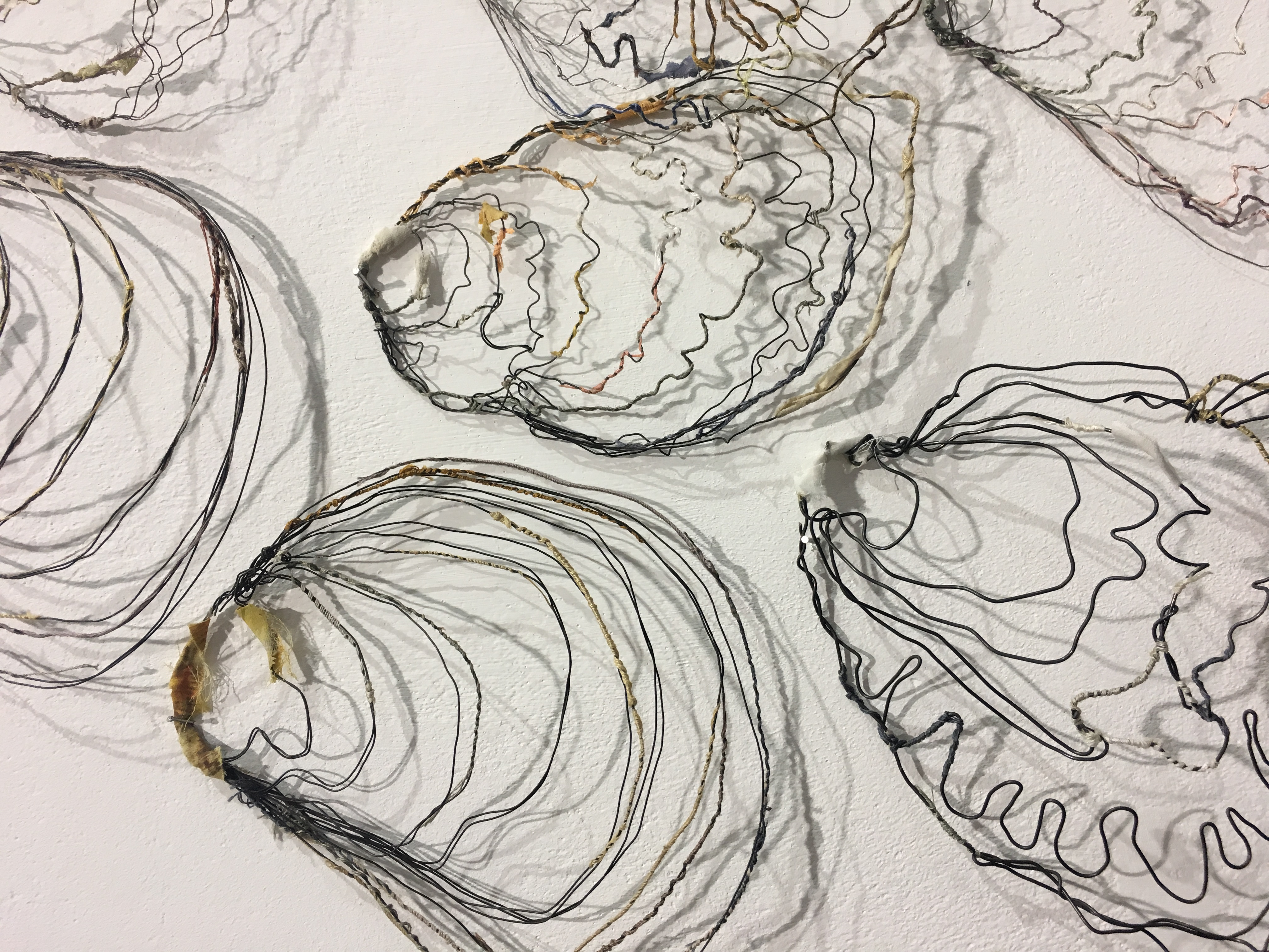 Natural objects also feature whether they are the driftwood, beautifully turned and moulded by the river, shells, – native and imported, giant barnacles or fossil corals that were amongst the ship’s ballast. The intricacy and diversity of oyster shells also attract me. A couple of years ago while doing wire sculpture I almost subconsciously found myself fashioning an oyster shell and binding it and one sculpture led to many more.