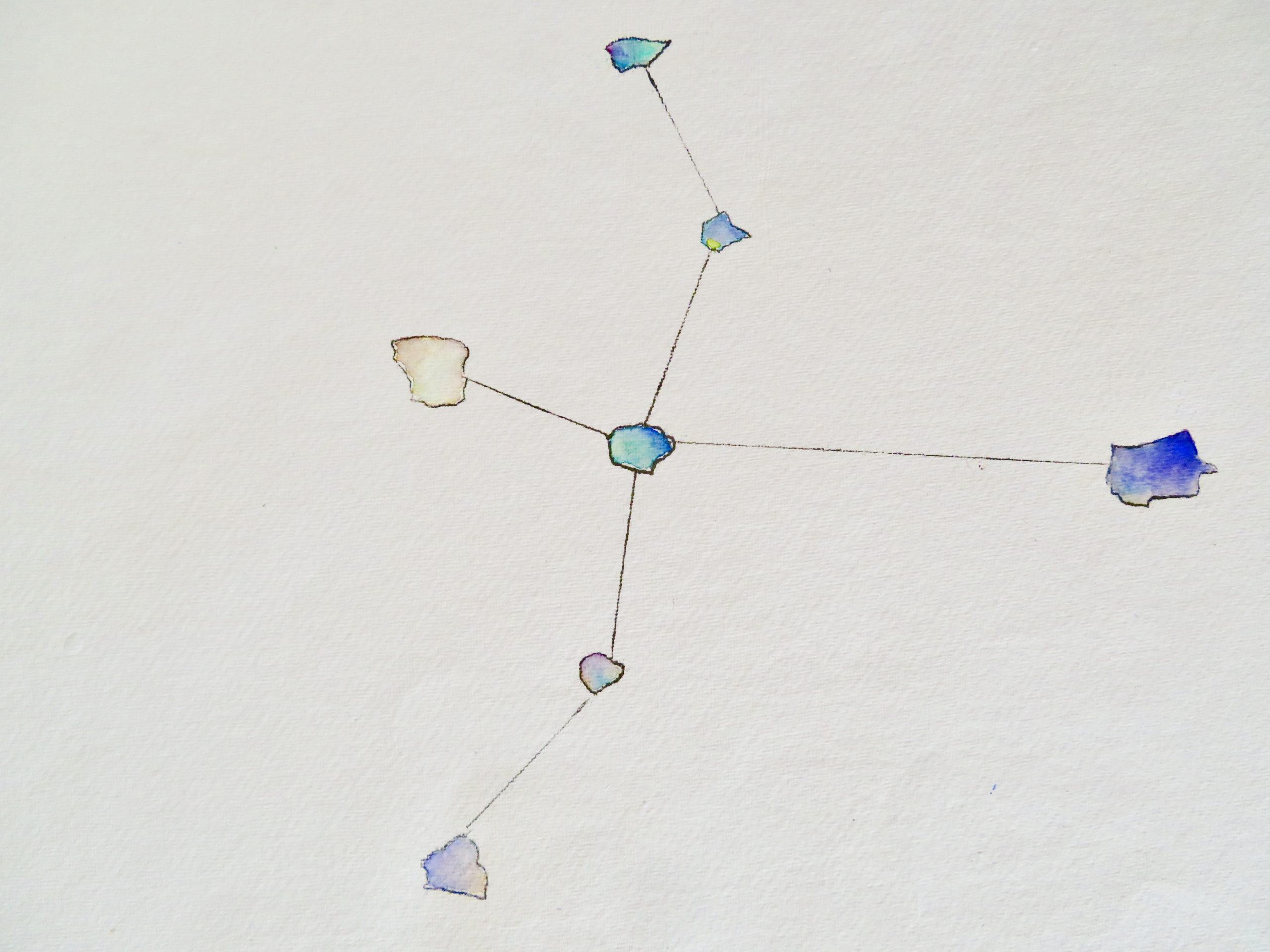 Finally, a word about my two-dimensional works: my constellation paintings are inspired by the fragments of iridescent glass or ‘stars’ found glimmering on the foreshore. I employed a watercolour technique used by Bernd Koberling for the glass fragments to convey their luminosity. As for my drawings – I have often thought that clay pipes, en masse, resemble fish and have tried to imbue the shoals of fish with movement and purpose; also to present the fossil corals as having attitude.
